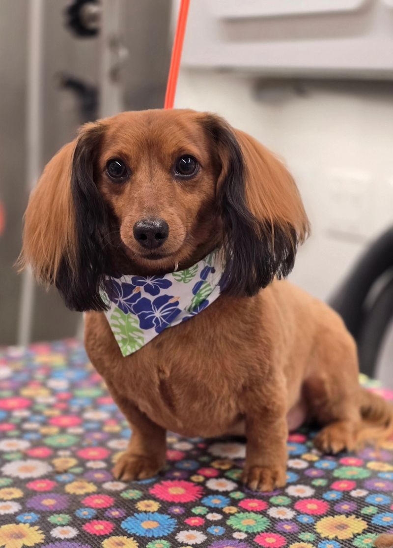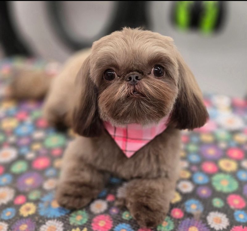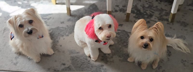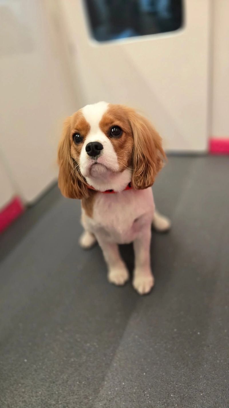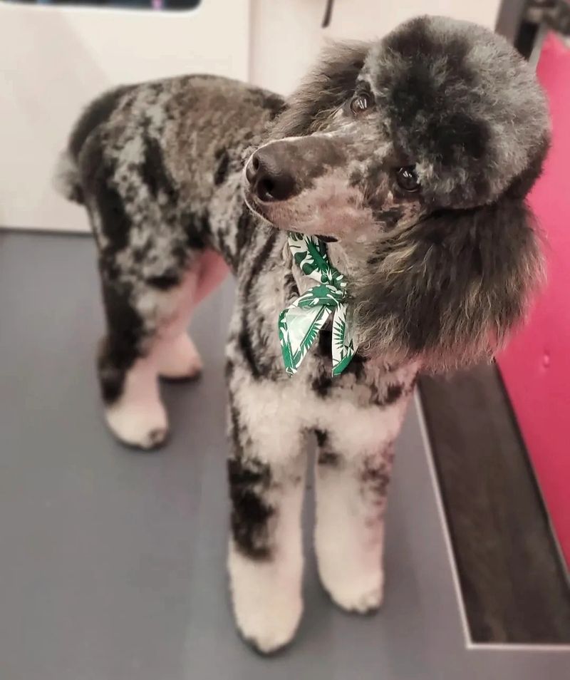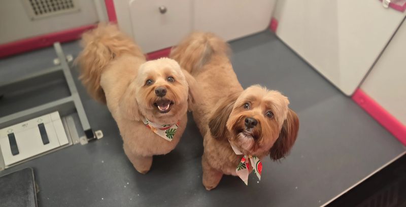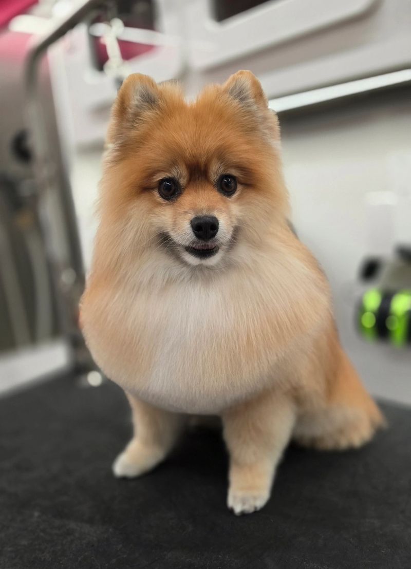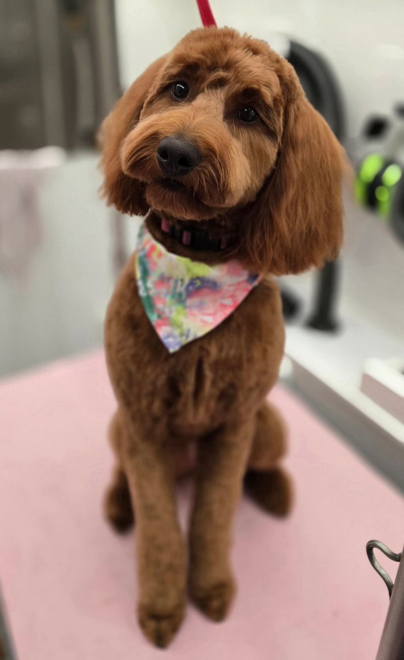 Whats include with every groom; shampoo, conditioner, blow out, brush out and a full haircut/trim/deshed. Nail dremeling, ear cleaning, teeth brushing and a spritz of cologne.The Works!